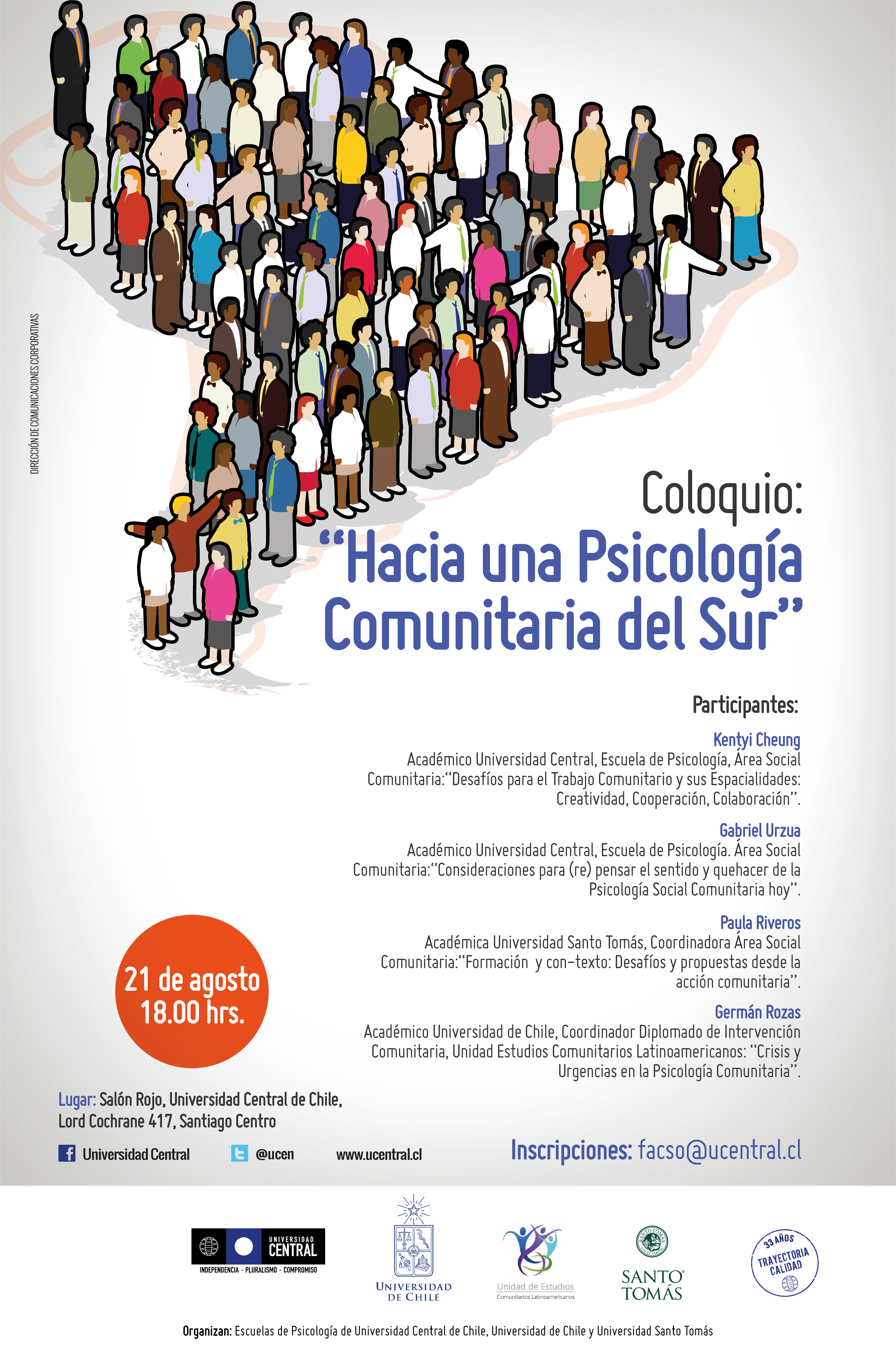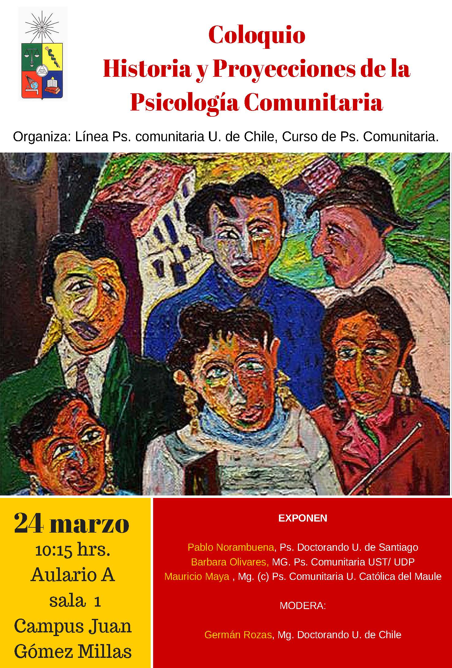 Coloquio "Historia y Proyecciones de la Psicologia Comunitaria" El curso de Psicología comunitaria y la Unidad de Estudios Comunitarios Latinoamericanos, invitan cordialmente a todas y todos a asistir al Coloquio "Historia y Proyecciones de la Psicologia Comunitaria" a realizarse el martes 24 de marzo a las 10:15 hrs. en la sala 1 del aulario "A" del Campus Juan Gomez Millas, de la Universidad de Chile.