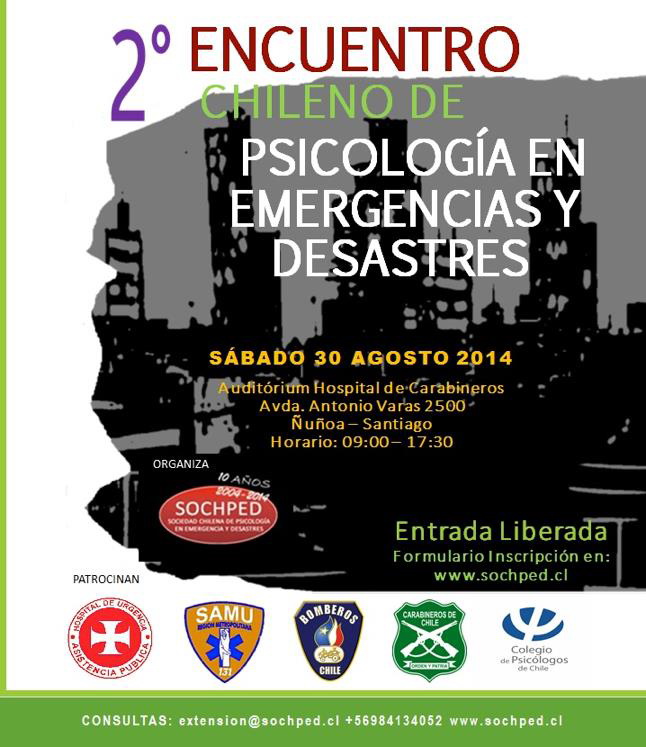 Memorias: Segundo Encuentro Chileno de Psicología en Emergencias y Desastres 2014 El Encuentro Chileno de Psicología en Emergencias y Desastres, fue pensado para generar un espacio, entre profesionales de psicología, destinado al intercambio académico y actualización de lo llevado a cabo con la especialidad a nivel nacional. En un espíritu de colaboración mutua, que facilitara la coordinación y articulación de redes. Su antecedente directo es el "Primer Encuentro Chileno de Psicología en Emergencias y Desastres" realizado el año 2011, el cuál deriva de una inquietud generada desde la investigación "Significados que dan a sus prácticas, psicólogos y psicólogas que intervinieron 3 primeros meses luego de ocurrido el terremoto y tsunami en Chile 2010, en relación con las comunidades afectadas". Desarollando este estudio y en conversaciones con colegas que intervinieron, escucho necesidades de coordinación, planificación, artiulación de redes, soporte del gremio y sistematización de experiencias locales relacionadas con Psicología en contextos de desastres en Chile.