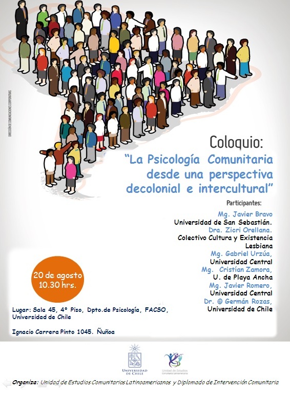 La Psicología Social Comunitaria desde una perspectiva Decolonial e Intercultural En este evento se realizará un debate sobre los alcances de una nueva perspectiva para la Psicología Comunitaria, que implica asumir la mirada decolonial. El tema central consiste en que hoy día persiste una colonización de nuestra consciencia o nuestra subjetividad que nos empuja a aceptar los estilos de vida y las formas de pensar de los países del centro, o de la metrópoli. Por el contrario, esta nueva perspectiva propone como cambio social ir más allá del tema económico, para incluir además, transformaciones en la construcción del otro, según la teoría de la alteridad, cambios en la concepción de mundo desde lo local y desde lo latinoamericano; una acción social en el fortalecimiento del sujeto comunitario, asociado al quehacer de los movimientos sociales, entre otras propuestas. La invitación es para el sábado 20 Agosto a las 10:30 hrs en la Sala 45 4° Piso, FACSO Ignacio Carrera Pinto 1045, Ñuñoa.