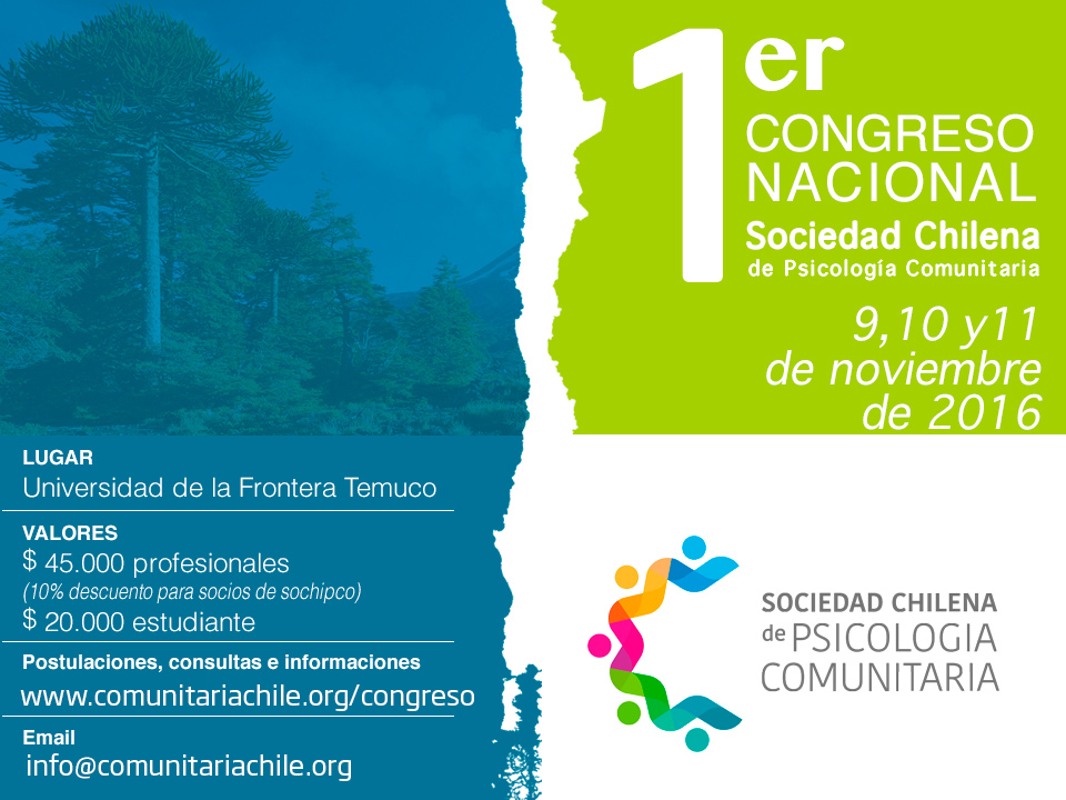 7ª CONFERENCIA INTERNACIONAL DE PSICOLOGÍA COMUNITARIA CHILE 2018 Les invitamos a participar de la 7ma versión de la Conferencia Internacional de Psicología Comunitaria Chile 2018. El tema central de la Conferencia enfatiza el intercambio y debate sobre la participación y el poder organizativo de las comunidades actuales en la generación de espacios de convivencia, solidaridad e integración. www.cipc2018chile.cl Celebración de los 70 años de la Psicología en Chile Se informa y se invita a la comunidad interesada a participar de este evento académico y celebración de los 70 años de la Psicología en Chile, el cual se realizará en la Universidad de Chile. Se dará cuenta de avances de investigación en el ámbito de la Psicología Comunitaria el Jueves 30 de Noviembre a las 16:00 hrs. y también de las otras áreas de la Disciplina en base al programa que se adjunta. Actividad abierta a profesionales, estudiantes y a futuros estudiantes de Psicología. La actividad se denomina : Encuentro 70 años formando psicólogos/as en Latinoamérica Lugar: Auditorio Central, Facultad de Ciencias Sociales Ignacio Carrera Pinto 1045, Ñuñoa DECLARACIÓN PUBLICA SOCIEDAD PSICOLOGAS/OS COMUNITARIOS DE CHILE Quienes formamos parte de la Sociedad Chilena de psicologia Comunitaria, manifestamos nuestra preocupación por la crirminalzación de las luchas del PUEBLO MAPUCHE y expresamos nuestro categórico rechazo al trato discriminatorio que reciben de la justicia chilena personas que han sido detenidas y sometidas a la ley antiterrorista. Ver Declaración Completa (PDF) VISITA DEL PROFESOR DR JORGE MARIO FLORES Tuvimos la visita del profesor Dr Jorge Mario Flores, quien hizo un relevante aporte en el conversatorio organizado por la Unidad, sobre Cultura Popular y Psicología Comunitaria Latinoamericana.